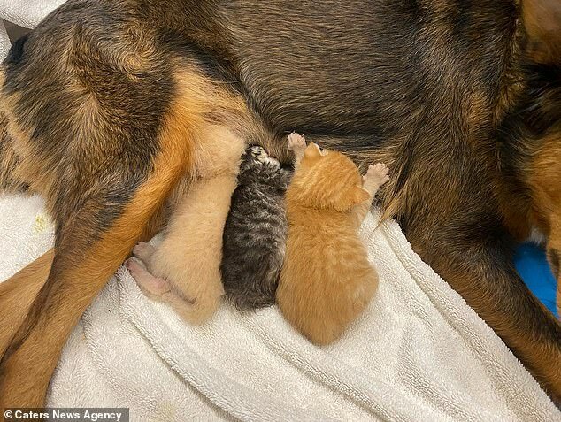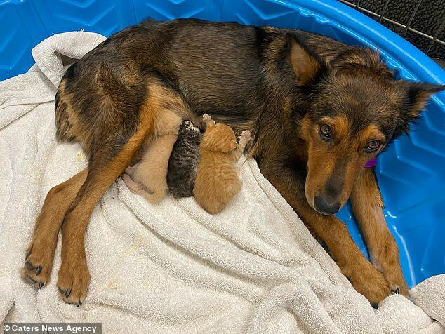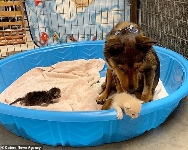 Potem w schronisku pojawiły się trzy osierocone kocięta niewiadomego pochodzenia. Trzeba było z nimi coś zrobić – ktoś podjął decyzję o oddaniu kociąt do wychowania przez Georgie. Gdy tylko sunia obwąchała pierwsze maleństwo, chwyciła je zębami za skórę i zabrała do swojej woliery. Zrobiła to samo z pozostałymi kociakami, a spokój i cisza zapanowały w duszy Georgii. Czworonoga mama zajęła się naturalną i znaną pracą: maluchy trzeba karmić, lizać i opiekować się nimi.