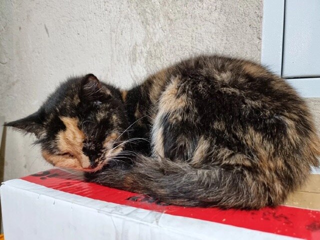 To właśnie w sklepie natknęłam się na tę kotkę. Na zewnątrz było już ciemno i zimno, a sklep miał się niedługo zamknąć. Gdy wyszłam, chuda, trójkolorowa kotka odsunęła się na bok, jakby wiedziała, że niedługo sklep zostanie zamknięty i będzie musiała znów szukać sobie miejsce do spania.