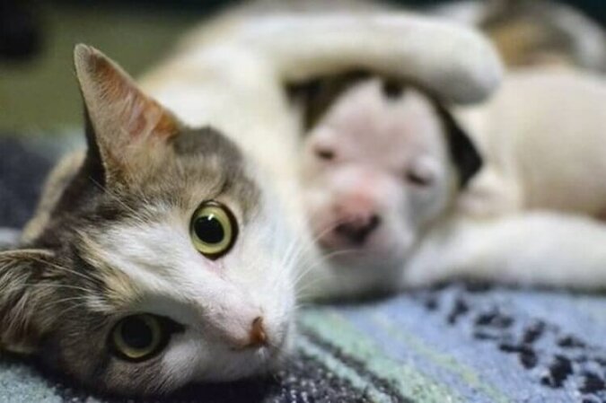 Pewnego dnia otworzyłam drzwi, a tam na progu... leży dwutygodniowy szczeniak. Obok siedzi Kicia i miauczy. Do dziś nie wiem gdzie go znalazła. Musiałam znowu opiekować się tym maleństwem.