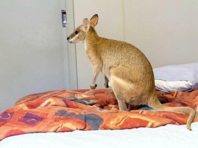 Pamiętacie bajkę „Masza i Niedźwiedź”, w której zbyt aktywna dziewczynka zdążyła zjeść z każdej miski i położyć się na każdym łóżku? Nie możemy porównać tych historii, ale coś podobnego wydarzyło się niedawno w Australii. Kangur walabia nie tylko wszedł do domu, ale celowo wlazł do łóżka, nie patrząc na to, że właścicielka była oburzona.