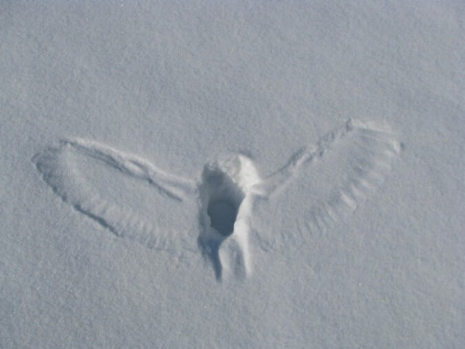 Ślad w śniegu po sowie skaczącej w zaspie za swoją ofiarą.