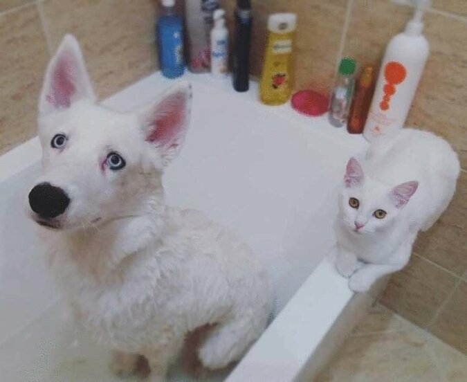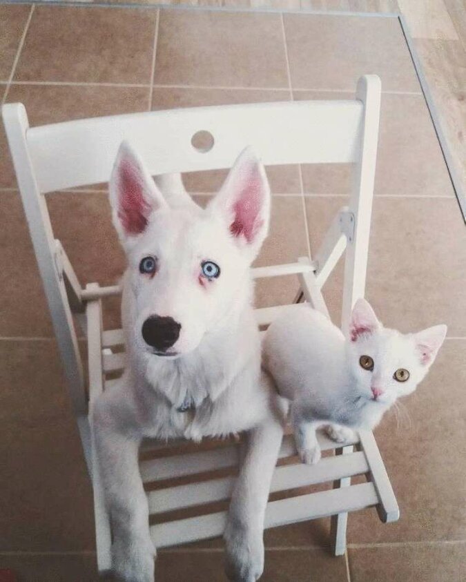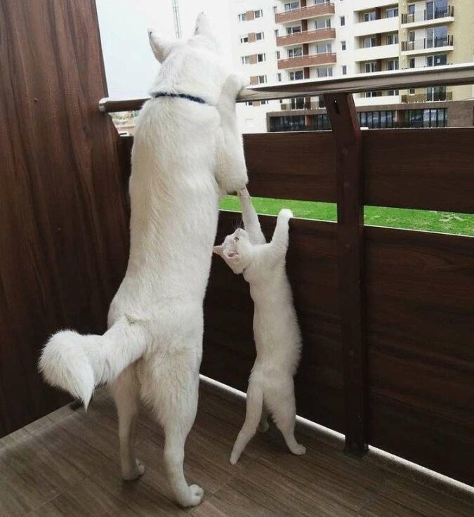 Bawią się zabawkami, siedzą i śpią w jednym miejscu. Jeśli kociak zasypia na rękach właścicieli, szczeniak również się tam przyczołguje. Robią wszystko razem przez cały dzień, aż do momentu, gdy idą spać.