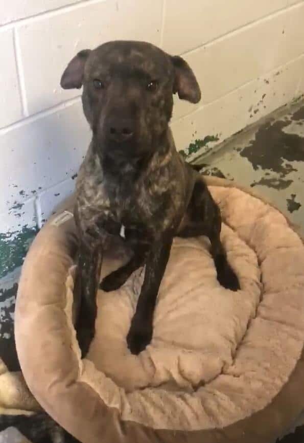 Widząc, jak zwierzak jest szczęśliwy że ma łóżko, pracownicy schroniska umieścili legowisko w budce dla psa. Pies natychmiast usiadł na legowisku, pokazując, jaki był zadowolony.