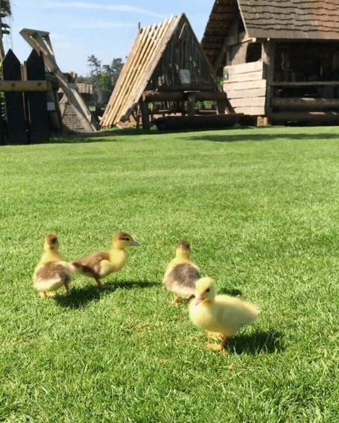 Niedawno tatuś zaczął uczyć swoje potomstwo pływać. W pobliżu zamku znajduje się fosa, w której bardzo wygodnie jest nurkować i ochłodzić się w upalny dzień! Sprytny pies podobno rozumie, że kaczuszki nie mogą obejść się bez wody, dlatego codziennie zabiera je na „lekcje pływania”!)