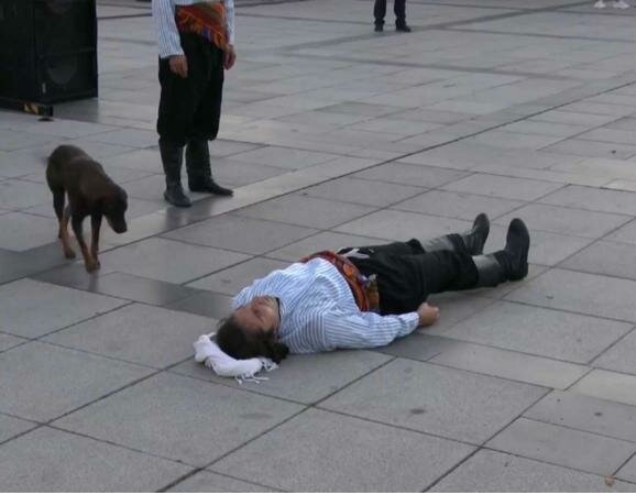 Grupa teatralna wystąpiła na placu miejskim, do którego dostęp mają wszyscy, zarówno ludzie, jak i zwierzęta. W trakcie spektaklu bohater Uzonsoy spada z konia i zostaje ciężko ranny, musi się położyć i odegrać ból, a w pobliżu nie ma nikogo. Ale bezdomny pies, który pojawił się znikąd, zdecydował inaczej. Zaskoczeni widzowie nie od razu zorientowali się, że to czysta improwizacja, a nie część spektaklu. Pies, oddany przyjaciel człowieka, widząc nieznajomego w tarapatach, pospieszył mu z pomocą słuchając głosu swojego bezinteresownego psiego serca!