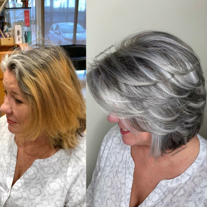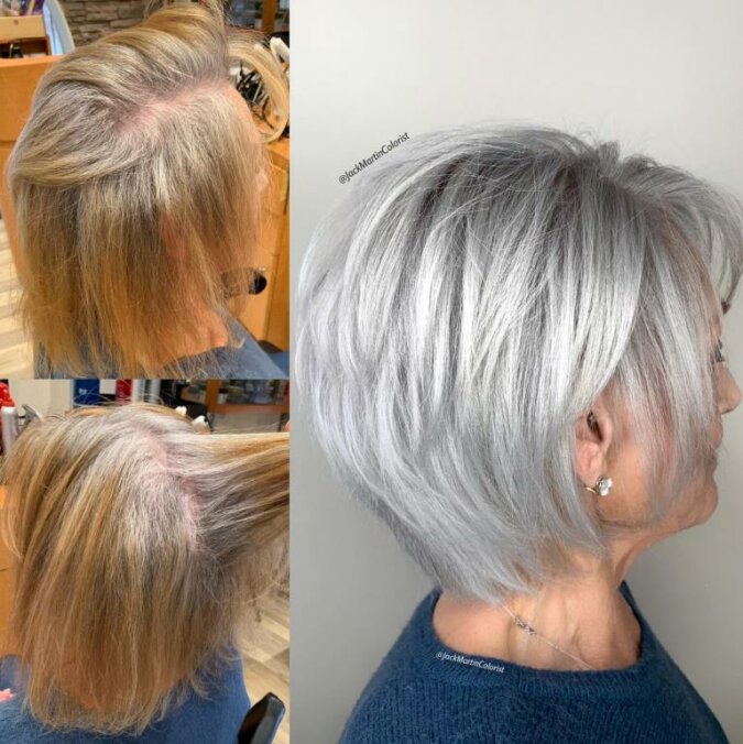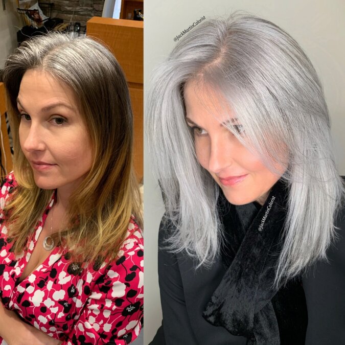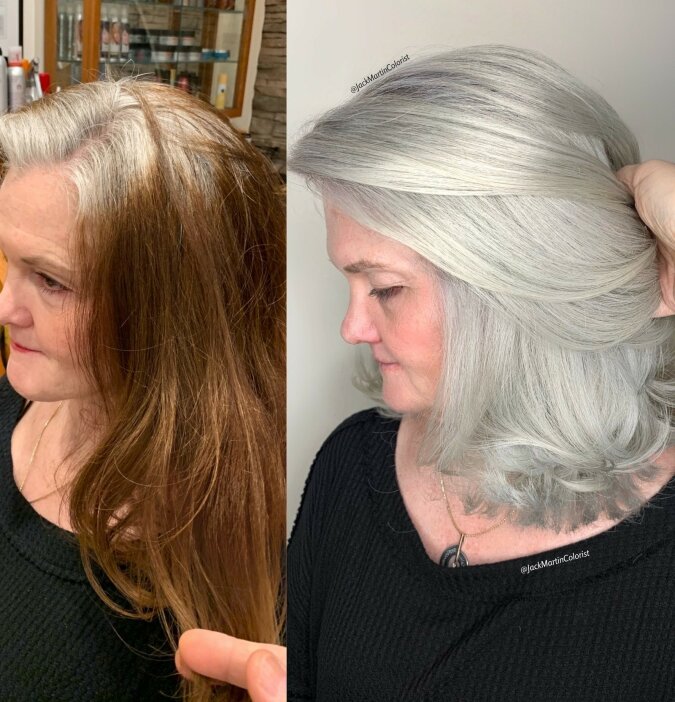 Martin się zgodził. I zrobili to: włosy kobiety zostały pofarbowane w srebrny kolor, który nadaje siwym włosom naturalny połysk, ale także całkowicie eliminuje potrzebę farbowania raz w miesiącu.