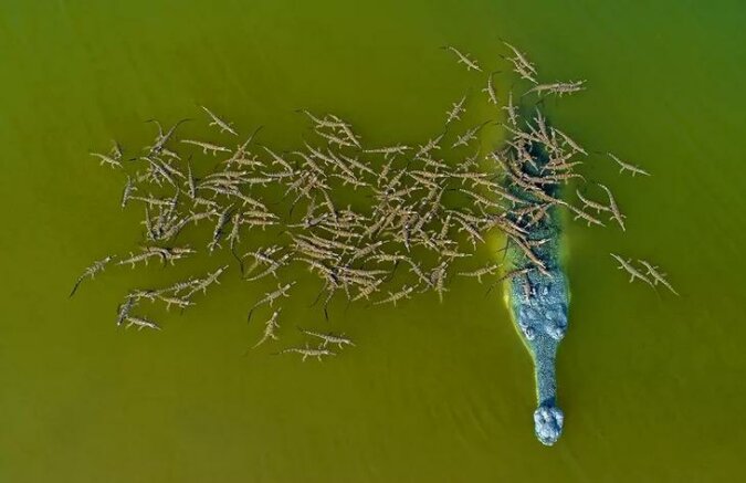 Indyjski fotograf Dhritiman Mukherjee spędził kilka tygodni w rezerwacie narodowym w Indiach o nazwie Chambal. Udało mu się zrobić niesamowite zdjęcie, na którym wielki krokodyl pływa po świętej rzece i „wozi” sto młodych krokodyli na swoim szerokim grzbiecie.