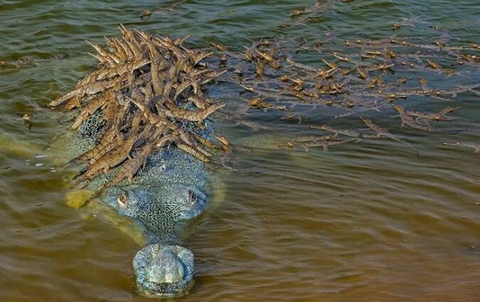 Na zdjęciu Mukherjee widzimy ogromnego samca, który prawdopodobnie zapłodnił siedem lub osiem samic, co wyjaśnia tak duże potomstwo. Wszystkie małe krokodyle osiadły na plecach ojca: to samce pełnią funkcje transportowe.