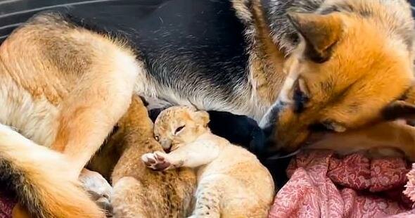 Na szczęście w pobliżu był owczarek niemiecki Sandra, która karmiła swojego szczeniaka. Zwykle z powodzeniem stawia na łapach do ośmiu szczeniąt w każdym miocie, a to jest bardzo ważne, ponieważ lwiątka nie są kociętami i potrzebują dużo mleka. Skład mleka psiego jest podobny do lwiego, zawiera wszystkie przydatne składniki. Ale był jeden poważny problem - Sandra nie lubiła kotów. A jak zareaguje na przerośnięte kocięta?