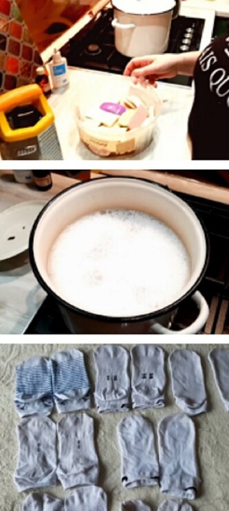 2. Cechą dobrej gospodyni domowej jest staranne wykorzystanie wszystkiego. Zbierz resztki kostek mydła, zetrzyj na drobnej tarce i dodaj do gorącej wody. Dodaj również detergent do mycia naczyń i 1 łyżkę nadtlenku wodoru. Zanurz skarpetki w tym roztworze i podgrzewaj przez 20 minut. Wylej brudną wodę i opłucz skarpetki.