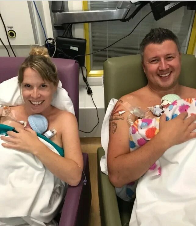 Kiedy Jenny była już w 6 miesiącu, para zdecydowała się wyjechać na wakacje na wybrzeże Kornwalii, ponieważ byli pewni, że dzieci urodzą się za 2-2,5 miesiąca, ale los postanowił inaczej. Kobieta już na wakacjach źle się poczuła i mąż zabrał ją do najbliższej przychodni. Po badaniu lekarze nalegali, że Jenny pilnie trzeba zabrać do kliniki w Oksfordzie, ale odległość 300 kilometrów była przerażająca. Lokalne władze zgodziły się i kilka minut później dostarczono helikopter Straży Przybrzeżnej i po 75 minutach kobieta znalazła się w rękach specjalistów, a następnego dnia została mamą.