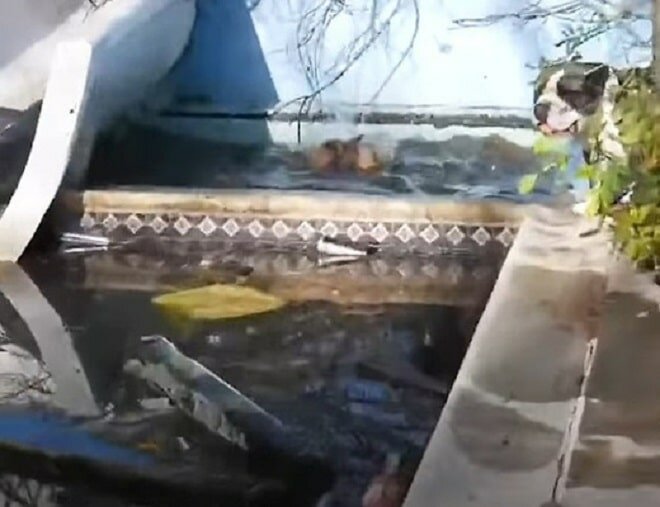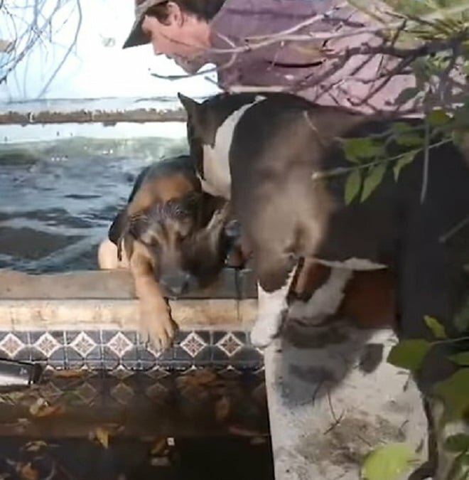 Chłopcy poszli za nim i nagle zobaczyli mały basen wypełniony brudną wodą. Był dostatecznie głęboki, a do środka wpadł pies! Nie mógł się wydostać i tylko rozpaczliwie bił łapami w wodzie.